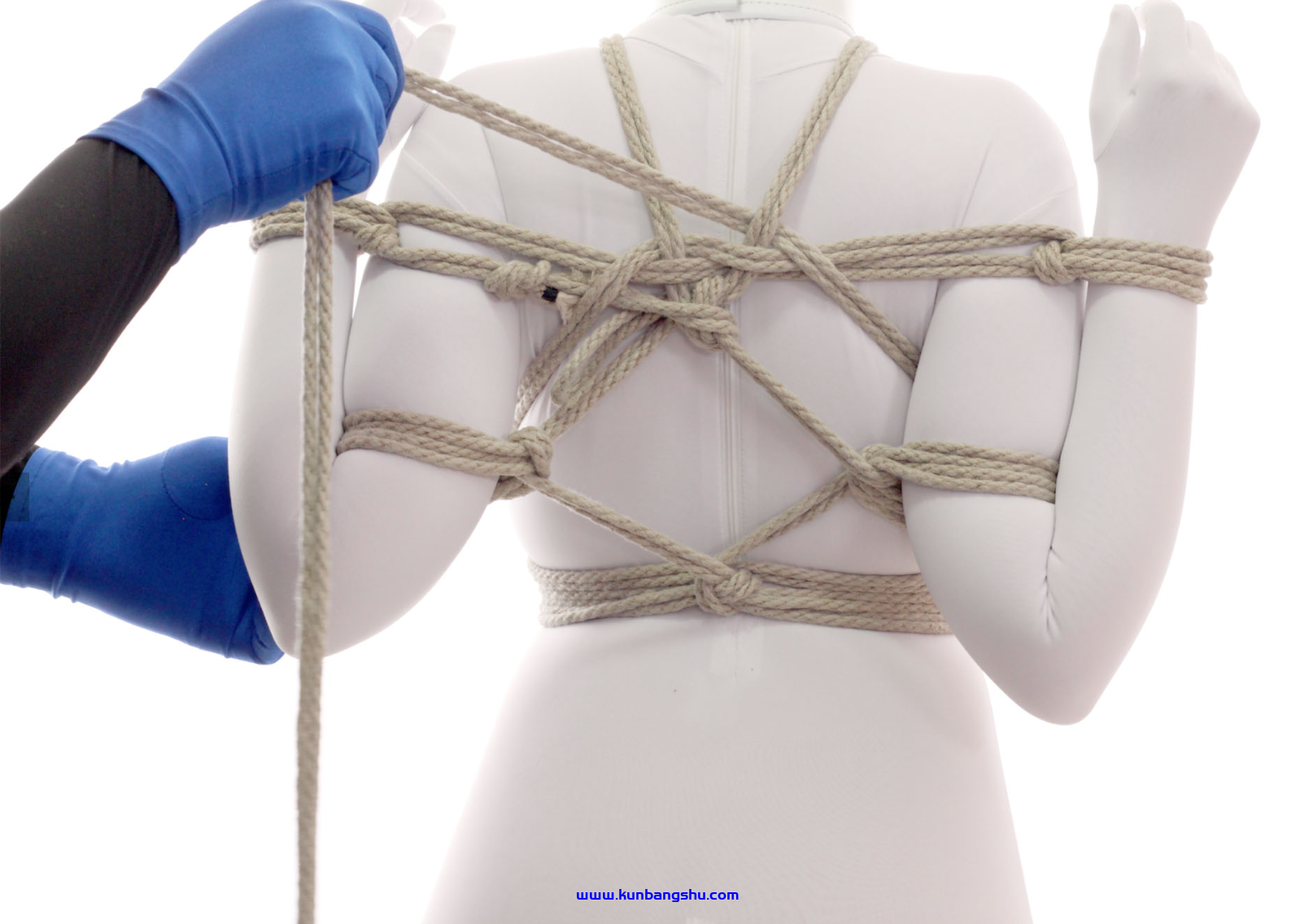 34.将尾巴捋到与第二个袖口同侧的肩膀上。(这里还有一个收紧捆绑的机会–如果你把肩绳往上拉,把刚绑完的节点抬起来,就会增加两只二头肌袖口的拉力)
